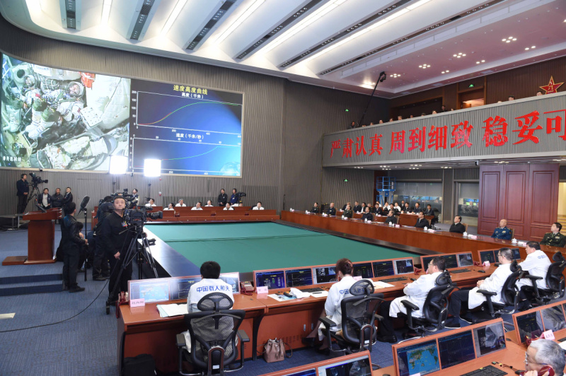 酒泉衛(wèi)星發(fā)射中心指揮大廳現(xiàn)場的電子屏幕上,顯示出火箭和飛船運(yùn)行的軌跡和參數(shù),工作人員密切監(jiān)視各項(xiàng)數(shù)據(jù),不時發(fā)出一道道指令。揚(yáng)聲器里不斷報告火箭和飛船的運(yùn)行狀態(tài):逃逸塔分離,助推器分離,整流罩分離,船箭分離,飛船進(jìn)入預(yù)定軌道,帆板展開,航天員飛行乘組狀態(tài)良好……